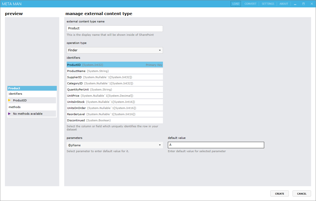 - When you drop the stored procedure you will be shown the following dialog, which allows to configure the external content type before creation. You should enter the external content type name and select the operation type as “Finder”. Select the first Parameter (@pID) and set it’s Default Value to zero for example