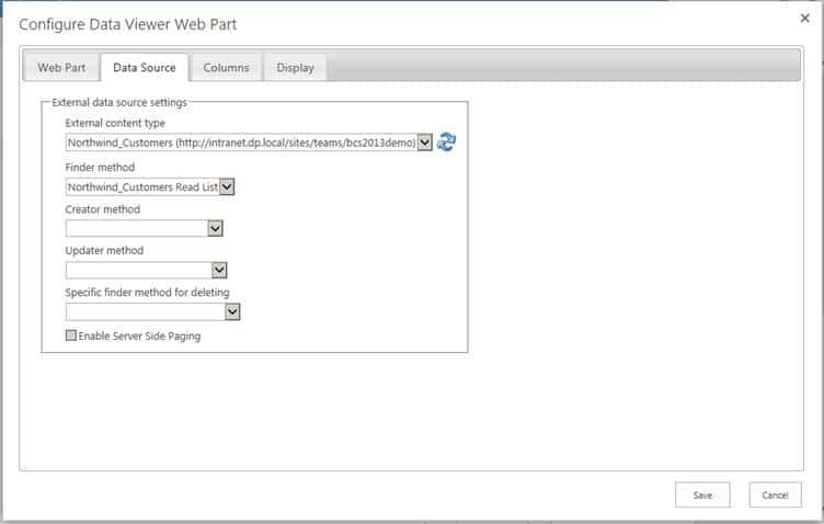 Using the Data Source tab, simply choose the External Content Type that you wish to connect to, then set your Finder Method, Creator Method, Updater Method, and Deleter Methods. You can use our Meta Man tool to help you create these methods for all kinds of external data types without having to author any code. This will be touched on later within this blog post.