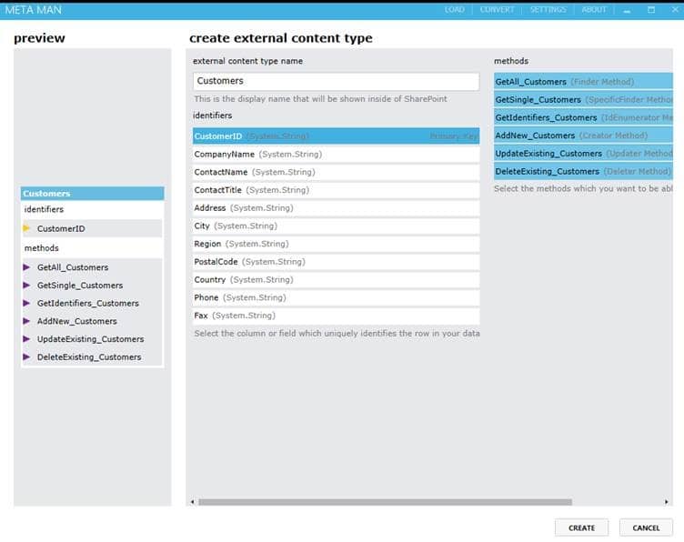 To create the Methods required for the CRUD functionality, simply select the methods you want your External Content Type to have.