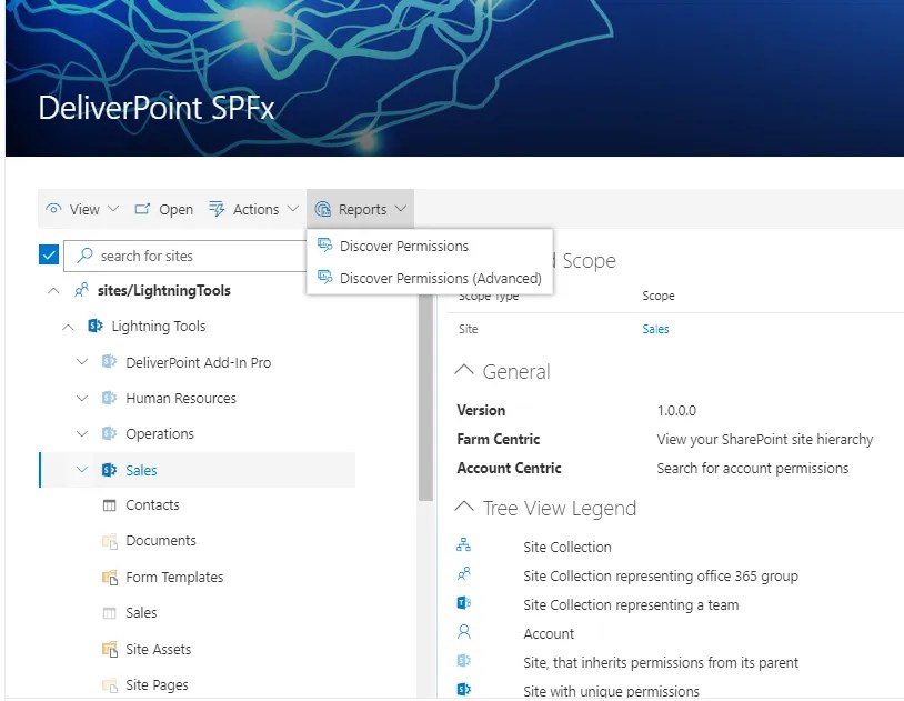 Managing Permissions in Modern SharePoint can also be carried out centrally, which is ideal for SharePoint Tenant Administrators. Tenant Administrators can add the DeliverPoint Client Side Web Part to any page within SharePoint, and have access to all Sites and Site Collections. The treeview and reports are all security trimmed, which makes it useful for Site Owners and Site Collection Administrators to access reports centrally too, without gaining access to Sites that they should not have access to.