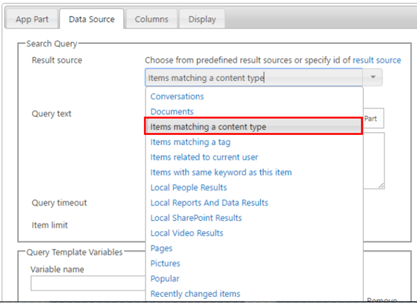 3. Select the ‘Data Source’ tab you will next select the ‘Results source’. In the drop down menu, select ‘Items matching a content type’.