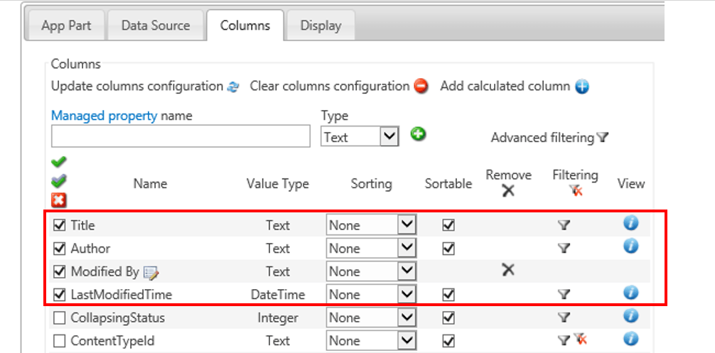 6. (optional) In the ‘Managed Properties field’ located in the ‘Columns’ tab, you will need to add the following text: ‘EditorOWSUSER’ if you wish to have access to ‘Modified By’ column.