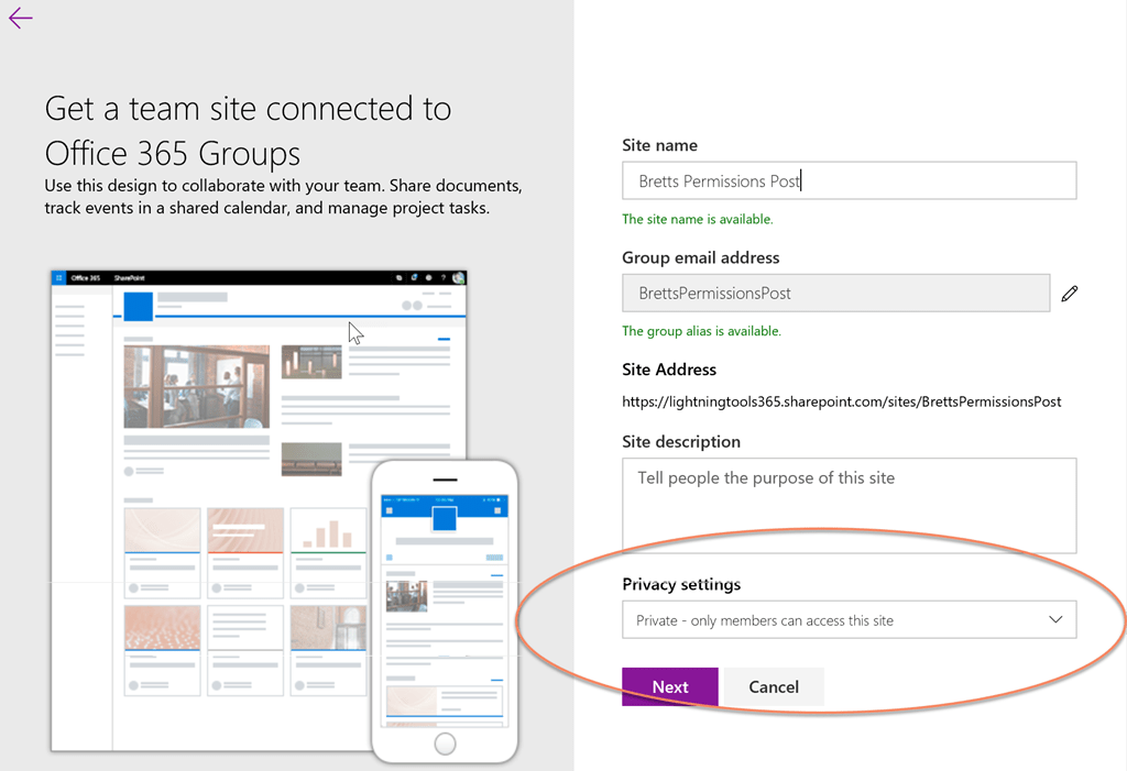 There is no question as to where this site will be created. Effectively, it is just a site, and the consideration of where in the site collection it will be placed, and whether it will inherit permissions has all gone. You’ll simply create a site, and not really need to care about where it is created. That means, that we don’t need to care about accidentally giving permissions to users through a lack of permission inheritance understanding. We simply decide on two things. Will this be a private or public site? If it is private, then who will be the owners of this newly created site, and who will be members? This granting of owners and members is illustrated in the screenshot below: