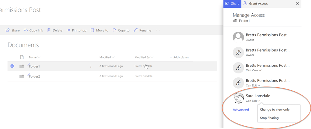 What I really like, is that upon clicking Manage Access, you can very easily remove the unique permissions or even change the level of permission that was granted from Edit to View as shown below: