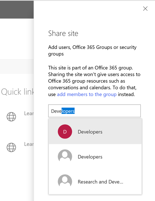 The latter option gives you more control than the initial page upon site creation. By clicking Share the site, we can now grant permissions using our Active Directory Security Groups! Using the Share the Site Only option also means that the users within the AD security groups, or individuals, will only gain access to the site itself, and will not benefit from the Office 365 Group membership. Having this simplicity, but still control, I have to say is a huge improvement to SharePoint permissions management.