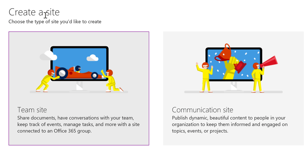 Screenshot to show the selection of a Team Site or Communication Site