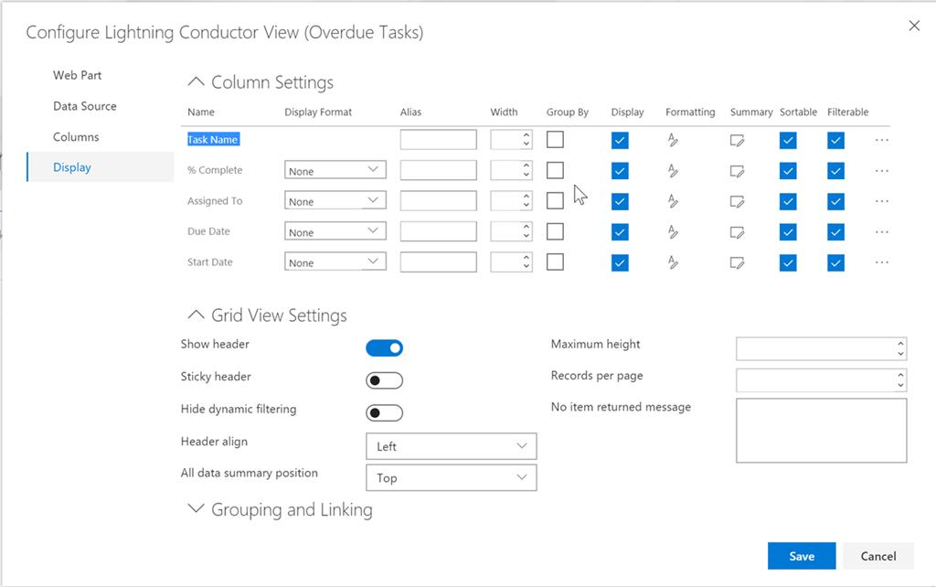 The web part tab allows you to specify the Data Source provider which can be Search or Object Model. The Object Model allows you to aggregate from all scopes including the entire tenant. Search offers a performance benefit but does not show immediate updates to your content as it changes. When using the Object Model, the Lightning Conductor runs 20 times faster than the predecessor (Lightning Conductor Add-In). Users can also specify the Display provider as being Grid View, XSLT or JSON. As per previous versions of the Lightning Conductor, the Grid View is simple to configure the columns to be displayed in a grid view layout, whereas the XSLT and JSON views allow you to customize the display however you like or to use one of our display templates such as the Calendar view.